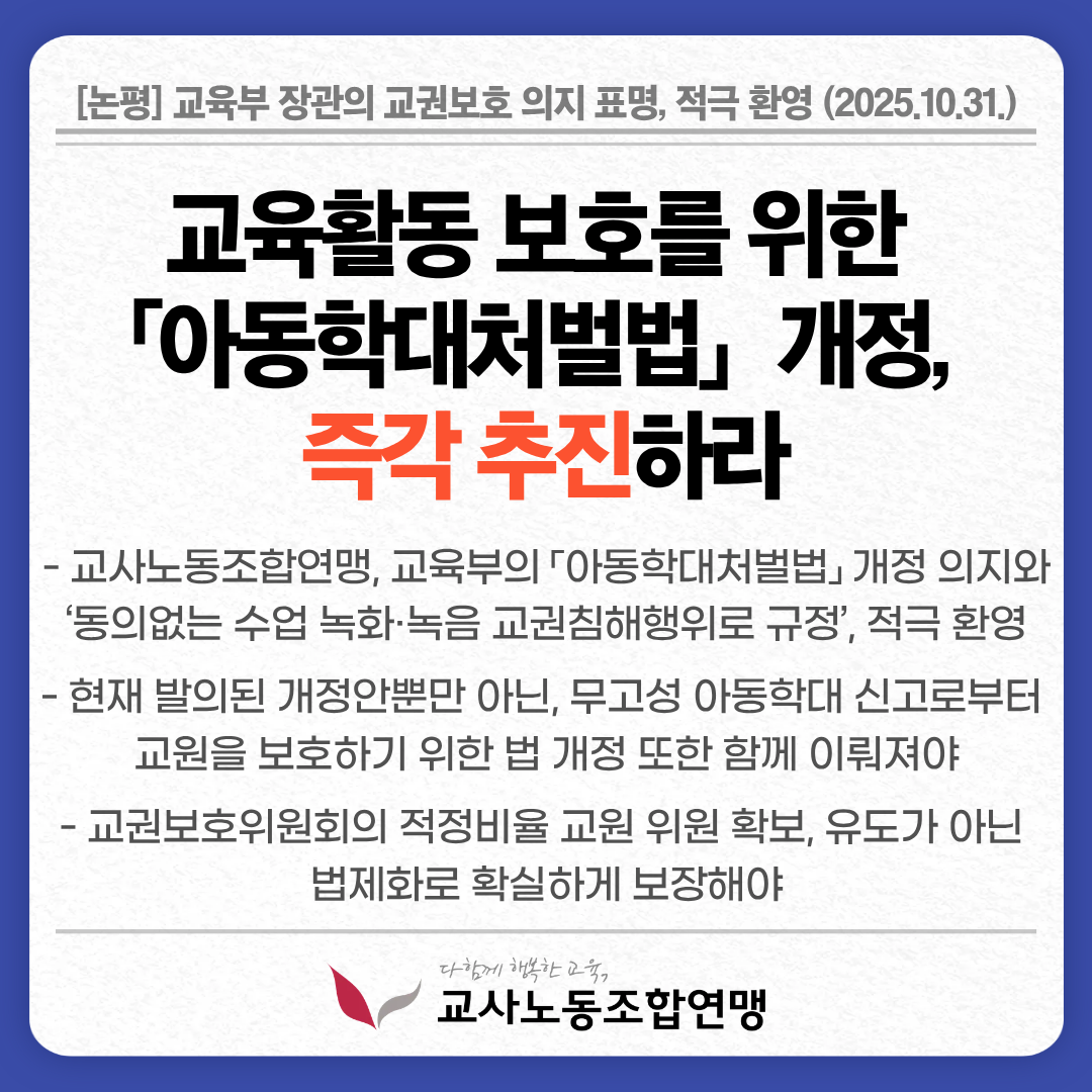 교육부 장관의 교권보호 의지 표명, 적극 환영(2025.10.31.)